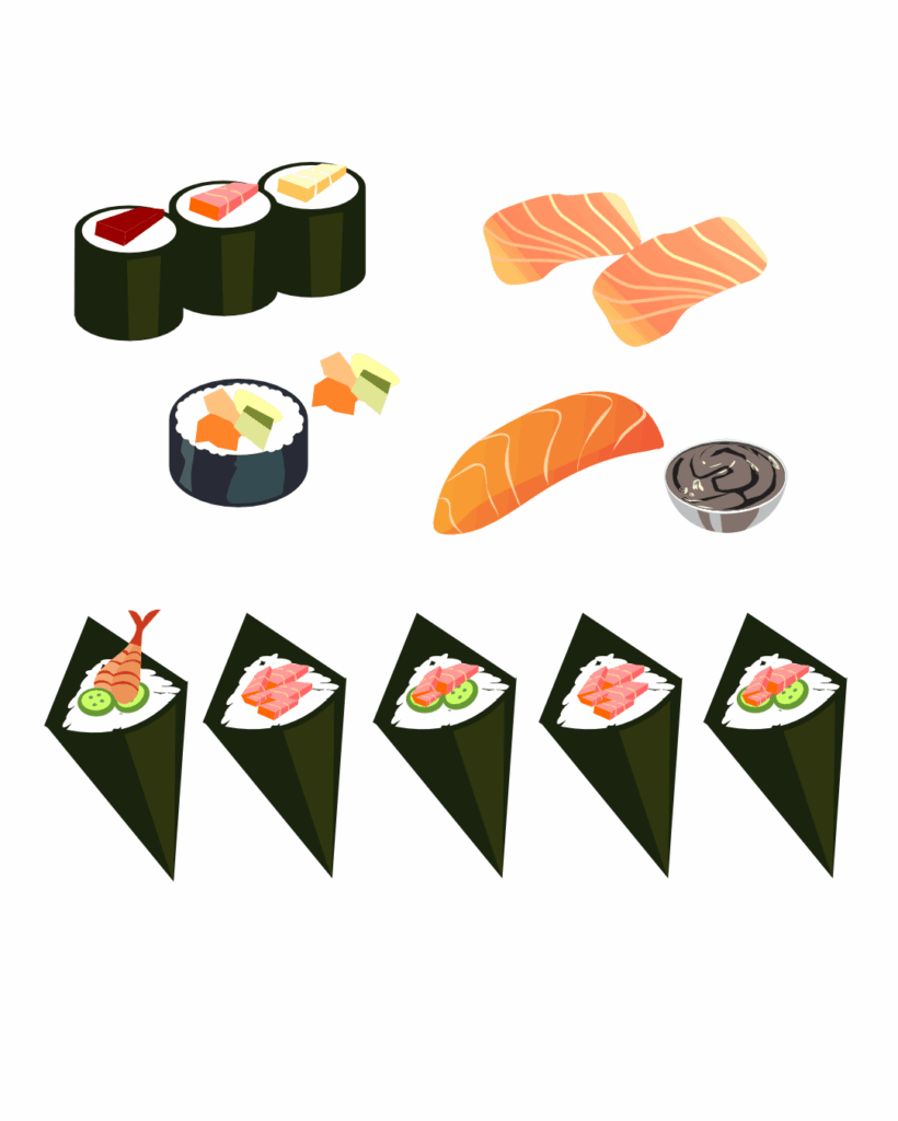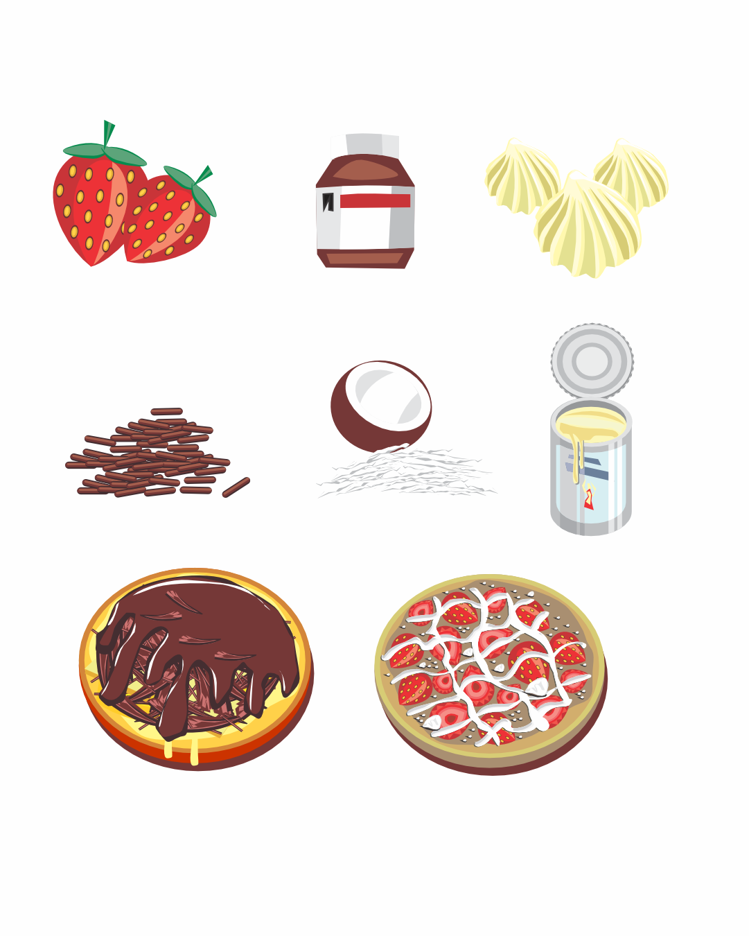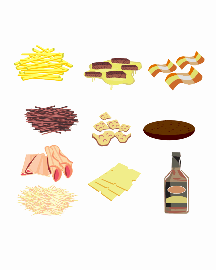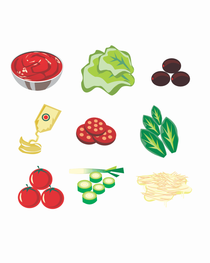 São ingredientes e produtos finais relacionados à pizza, sanduíches, comida japonesa, batata recheada e algumas porções