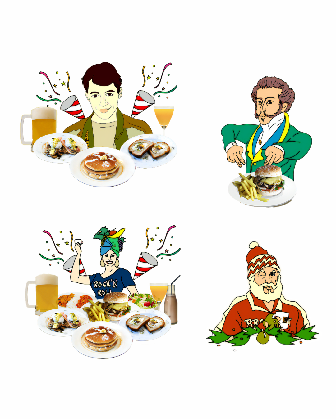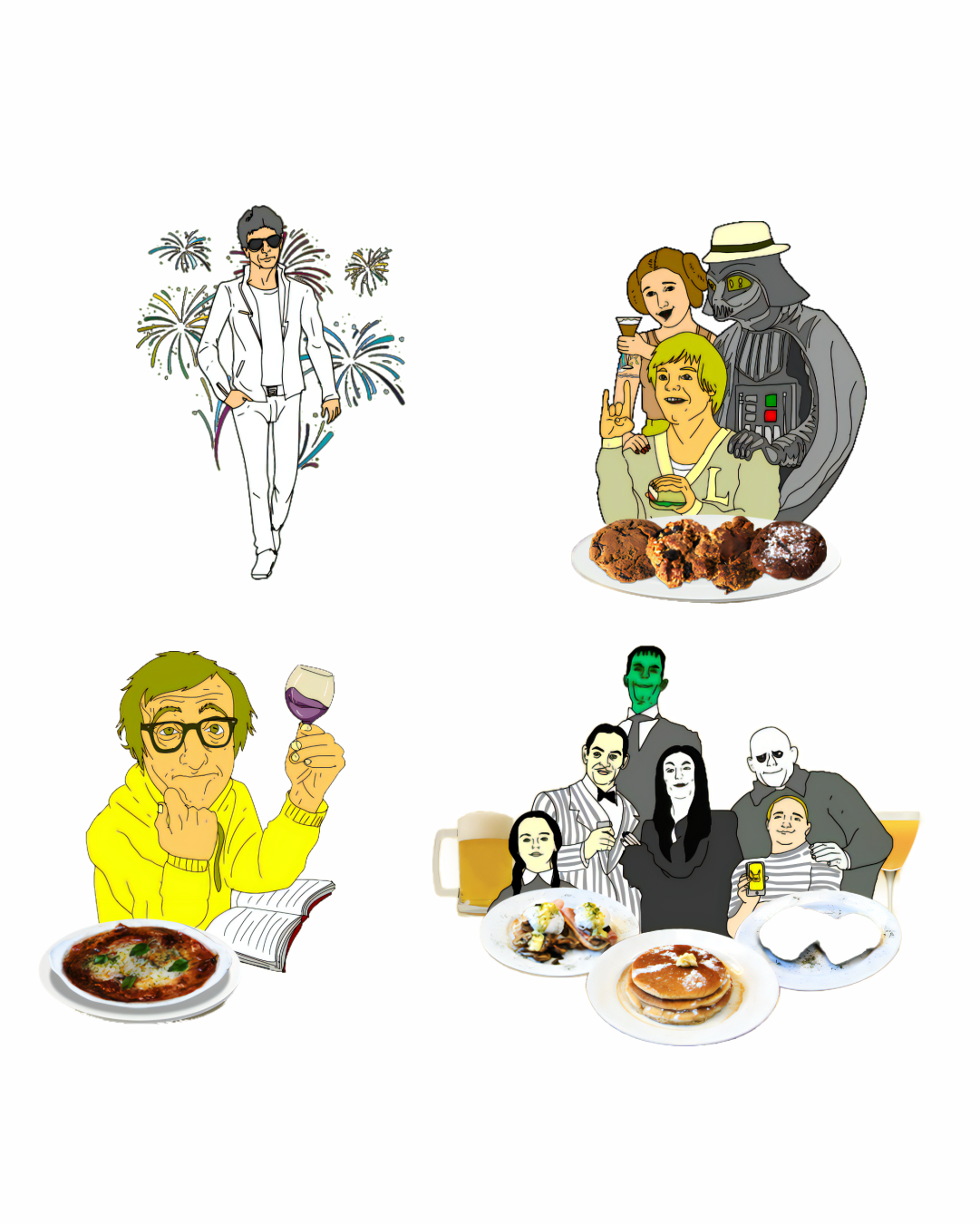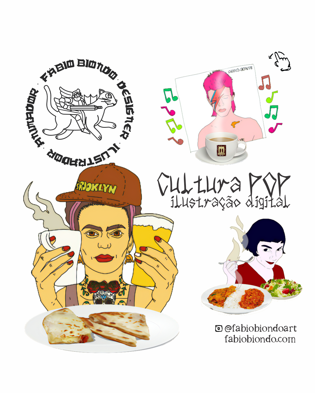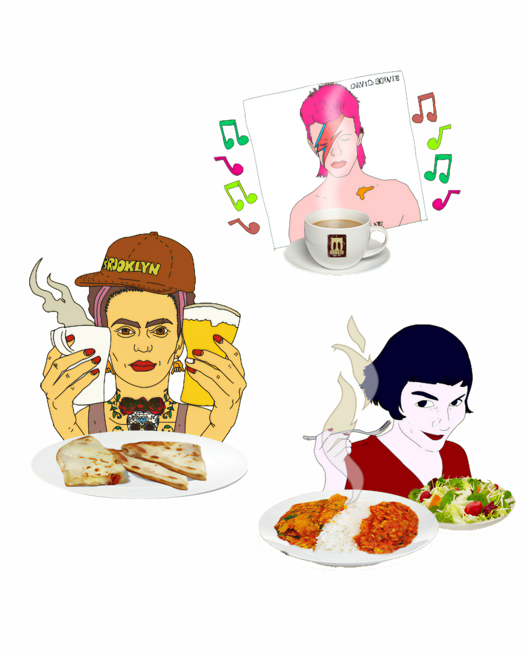 No começo dos anos 2010 fiz essas ilustrações inspiradas em ícones da cultura pop contextualizados no perfil dos clientes do empreendimento, que era um restaurante e cafeteria inspirado no bairro do Brooklyn frequentado por amantes de cinema, música e moda. As ilustrações vetoriais foram compostas com recortes de fotos dos pratos do cardápio.
