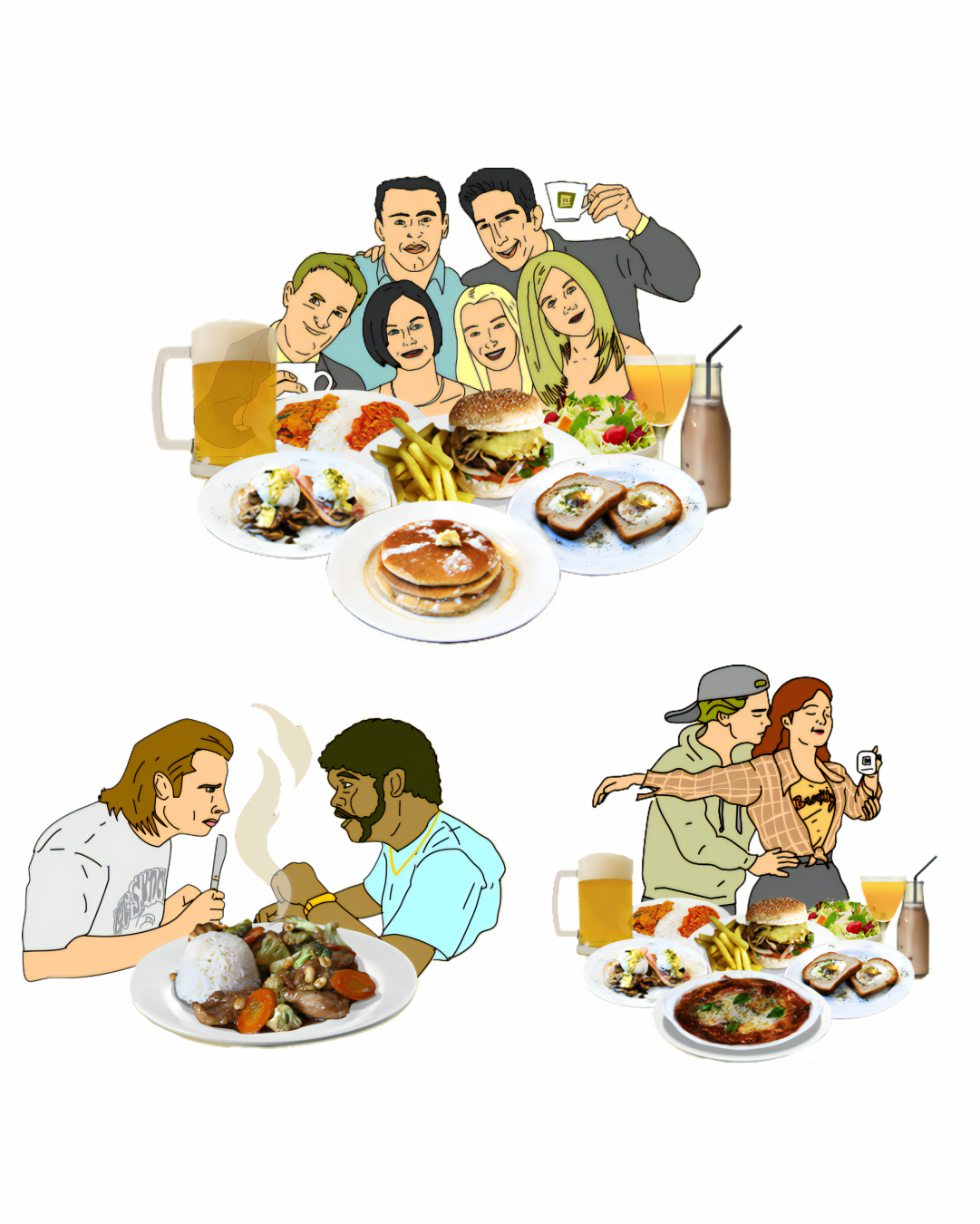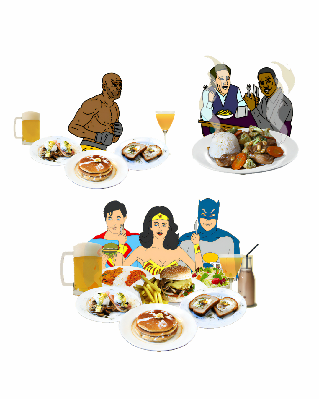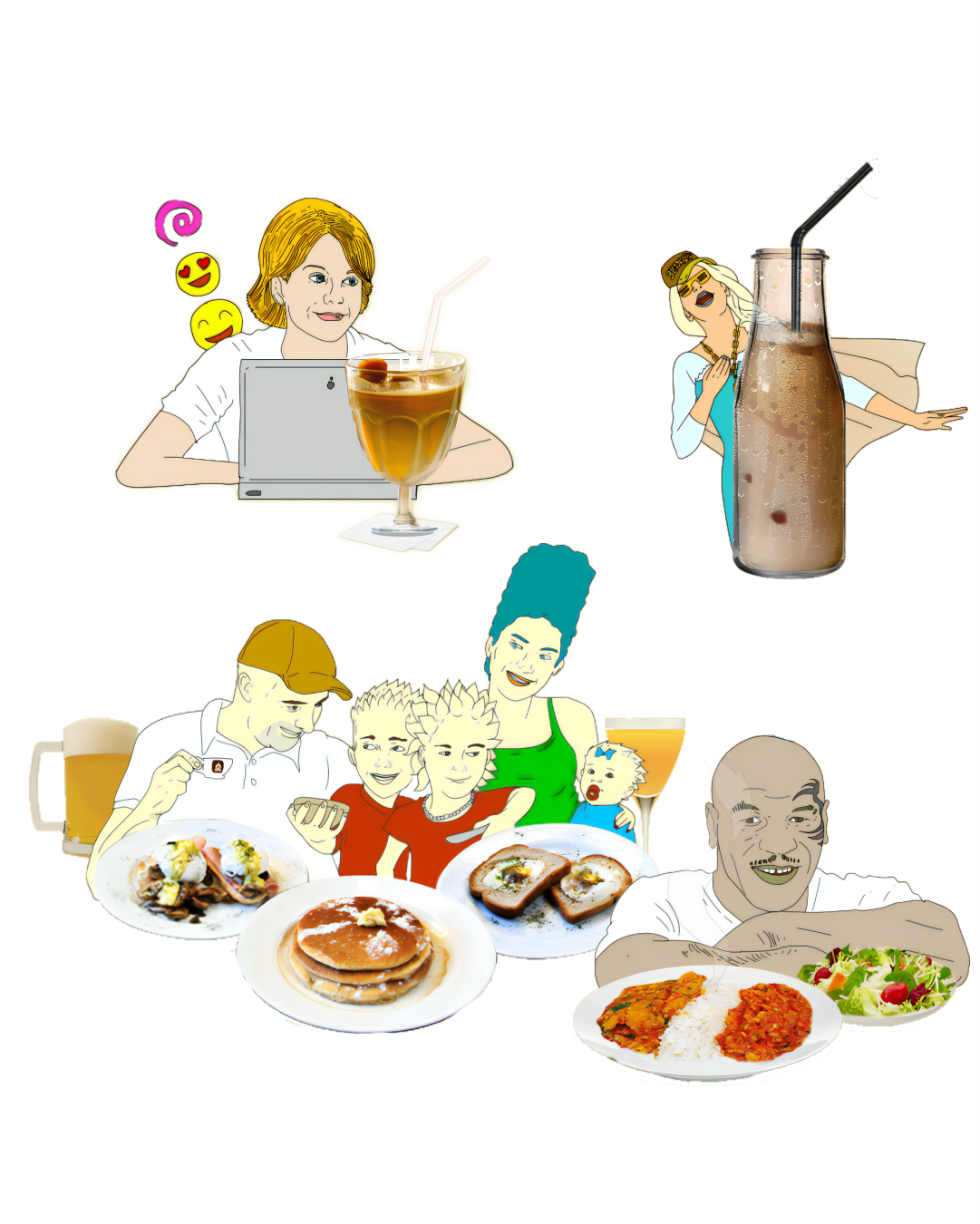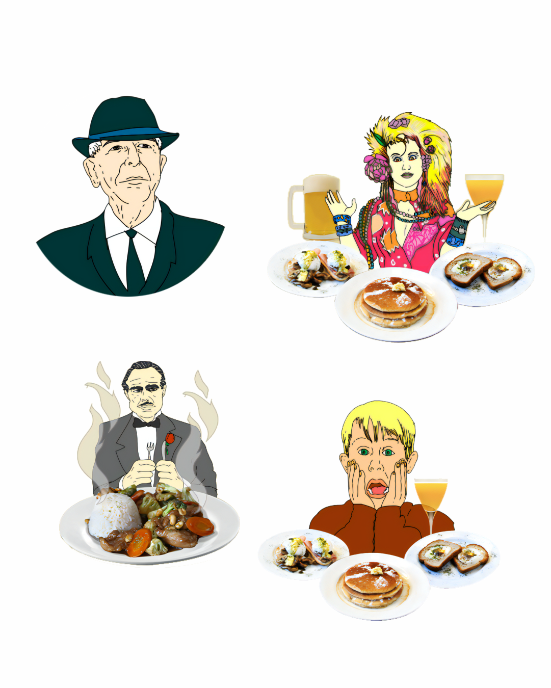 No começo dos anos 2010 fiz essas ilustrações inspiradas em ícones da cultura pop contextualizados no perfil dos clientes do empreendimento, que era um restaurante e cafeteria inspirado no bairro do Brooklyn frequentado por amantes de cinema, música e moda. As ilustrações vetoriais foram compostas com recortes de fotos dos pratos do cardápio.